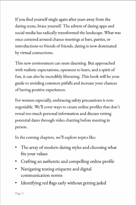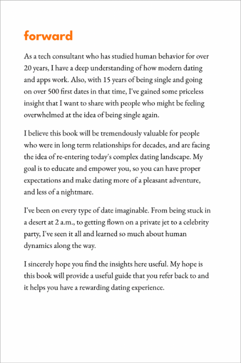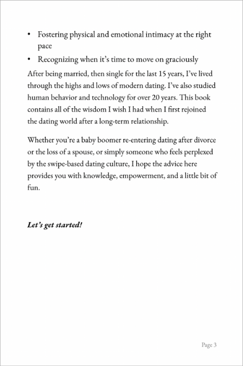 Return to Dating is for anyone who was in a long term relationship, only to find themselves single in an ever changing world. Online dating, knowing when you're ready, and how to navigate it all is in this practical guide. It covers topics like sex, alternative relationships, who picks up the check and more. I wrote this book after being single on and off for 15 years, and met so many people that felt lost and confused, so I wrote this book for them.
